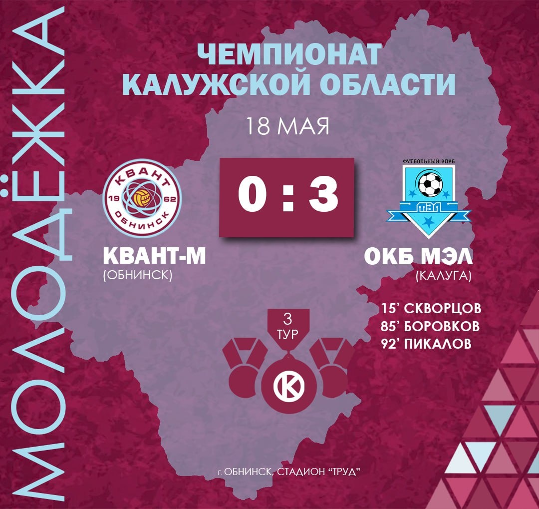 Молодёжка Кванта сегодня в 3️⃣ туре Чемпионата Калужской области принимала ФК "ОКБ МЭЛ" из Калуги. К сожалению, юноши повторили вчерашний результат 😔основы. Пропустив уже в дебюте, Квант-М до последнего сохранял шансы на спасение против недавнего обладателя Кубка Губернатора и одержавшего две победы на старте чемпионата соперника. Но в конце калужане сняли все вопросы о победителе.