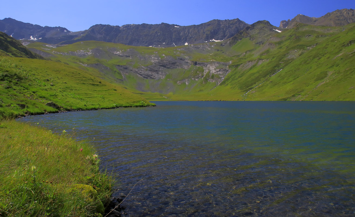 Утро было солнечно-лунным. А небо практически безоблачным. Хотя, из-за вершин периодически за нами "подсматривали" облака. План на день был не очень большой - подняться к озеру Провальное и сделать радиальный выход под западную сторону перевала Семнадцати к озеру Лазурное. Поэтому мы не торопясь собрались и двинулись в долину реки Кяфар. "Перескока" через реку по камушкам не предвиделось, поэтому мы перебрались через реку в брод. За нашими водными процедурами из зарослей травы внимательно наблюдала местная "аборигенша" Юра обнаружил крокусы и принялся приобщаться к прекрасному Поднявшись еще метров на 150 мы оказались у самого крупного озера Архыза - озера Кяфар Не отснять панораму было грешно. Хотя в итоге я остался не совсем доволен результатом, но.. В середине 800 метрового озера я повторил панорамные потуги. Потом уже занимался ими по мере удаления от озера Озеро наполнялось водой из двух рек. Одна из которых вытекала из озера Лазурное (слева). Как и в 2013 году в верховьях озер