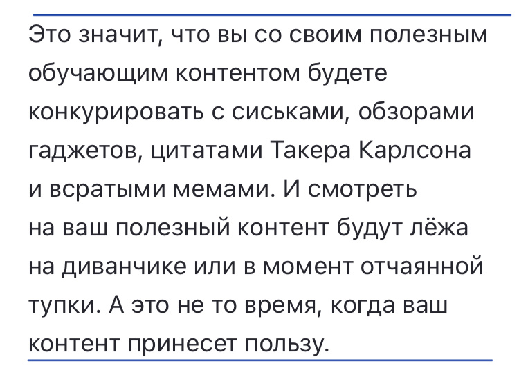 Вот такую фразу я прочла в блоге мастера слова, специалиста по продвижению. И с точки зрения автора, блогера, я прекрасно понимаю о чем идет речь. Скрин из статьи: Дело не в том, что польза не нужна. Дело в том, что такие каналы развиваются очень и очень медленно. И если блогер ставит перед собой цель - развивать блог, то сейчас то время, когда польза блогеру не принесет желаемого результата. И это касается не только рукодельных блогов. Любых, в которых есть обучающий элемент. Почему? Да потому, что за последнее десятилетие интернет настолько переполнен разного рода информацией, что найти в этом океане текстов и видео то, что нужно, становится сложно. Заводишь в поисковик свой запрос, а в ответ миллионы ссылок. И пока найдешь ответ на свой вопрос, который блогер доносит в доступной тебе форме, уже забываешь, а что, собственно говоря, я ищу? Читала комментарии к предыдущим статьям, убеждаясь в том, что я не ошибаюсь. Сейчас каждый может включить камеру и снимать то, что он делает. Кажд