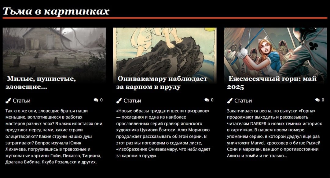 #анонс В мае в арт-разделе журнала вы найдете: – Статью, посвященную пугающим образам домашних животных в картинах художников прошлого и современности: от Тициана до Якуба Розальски. – Традиционный выпуск «Ежемесячного горна» с новинками комиксов: Lady Baltimore: The Daughters of Medusa, Grimm Fairy Tales: Alice in Zombieland и другими. – Статью о седьмом листе «Новых образов тридцати шести призраков», гравюре «Изображение Онивакамару, что наблюдает за карпом в пруду». Также читайте в номере рецензии на артбук «Тлетворный дух», комикс «Звери с Бренного холма. Животные порядки», графические романы «Королевская кровь» и «Гнев Фантомаса», а также мангу «Ночь живых кошаков». Новый номер выходит традиционно в ночь с 19 на 20 число. Ждите! И, кстати, напомним, что наши спонсоры на Бусти могут все это и многое другое прочитать уже сейчас: boosty.to/darker