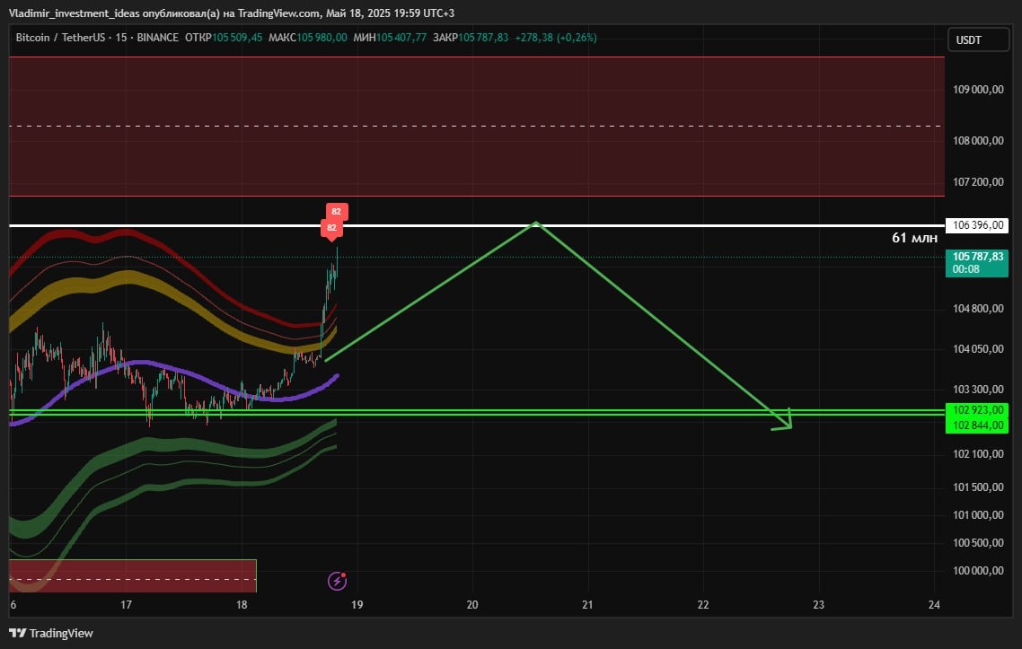 Новый уровень, нарисовался в зоне 106396, выше больше нет ничего. Чтобы продолжить рост, нужно собрать ликвидность снизу. Ожидаю спуск далее до зеленых линий