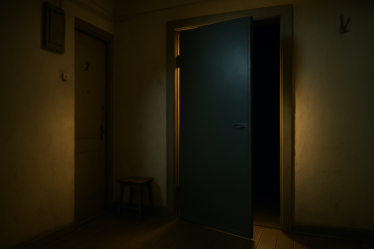 Когда Витя снял квартиру на втором этаже, он даже обрадовался: ремонт свежий, техника на месте, соседи тихие. Только одна вещь смущала — дверь в коридоре. Вторая. Узкая, металлическая, без ручки. На плане квартиры её не было. Хозяйка по телефону ответила уклончиво: «Старый технический проход, не работает, просто не трогай.» Он не трогал. Первые дни прошли спокойно. Обычная рутина: работа, еда, сон. Но на третью ночь он услышал щелчок. Будто защёлка. Подошёл. Дверь была чуть приоткрыта. Не до конца, но достаточно, чтобы чувствовался холод. Заглянуть не решился. Закрыл. Поставил табурет. Утром табурет стоял на месте, дверь — плотно закрыта. Решил, что показалось. На следующую ночь — снова. Щелчок. И дверь — на два пальца открыта. Витя подпер её тяжёлым чемоданом. Заверил себя, что соседи сдуру пошутили, что это сквозняк, что мало ли. Потом начались сны. В каждом — он стоял перед этой дверью. За ней — чёрная комната. Без света, без стен. Там кто-то звал. Тихо. По имени. Без угрозы, но нас