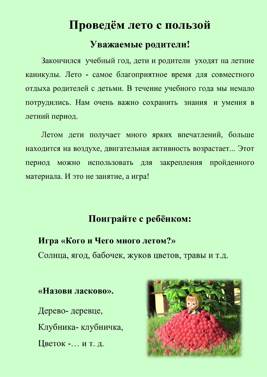 Закончился учебный год, дети и родители уходят на летние каникулы. Лето - самое благоприятное время для совместного отдыха родителей с детьми. В течение учебного года мы немало потрудились. Нам очень важно сохранить знания и умения в летний период. Летом дети получает много ярких впечатлений, больше находится на воздухе, двигательная активность возрастает... Этот период можно использовать для закрепления пройденного материала. И это не занятие, а игра!