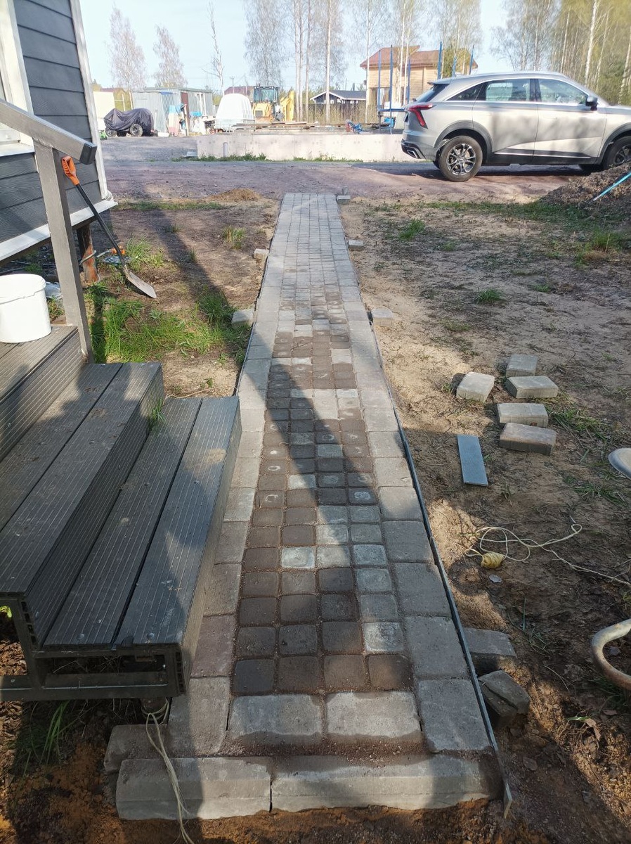 Эх путь дорожка. Весна опять пришла, и лучики тепла разбудили дачников и принялись они в земле копаться. А я чем хуже? И тоже взял лопату в руки. Плитка - подарок соседа давно уже ждала своего часа. Песок за три года улежался и не потребовал трамбовки. Смущало только отсутствие бордюра, но заменил его остатками цементного сайдинга, закопав его по краям дорожки. В интернете прочитал, что класть плитку можно и без песчано-цементной смеси прямо на песок. Так и сделал. В общем 6 часов и дорожка готова. Сам не ожидал такой скорости, теперь буду наблюдать, как поведёт себя при эксплуатации.