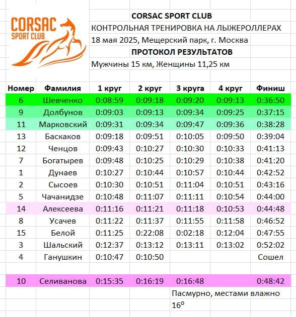 🏁 Результаты контрольной 📌 Самое важное, что отметим, так это победу Шевченко Я., который второй раз подряд обновляет личный рекорд трассы — теперь это 36:50. Это при том, что асфальт на трассе был местами влажный. 💡Еще из интересного: Распределение сил по кругам у Ченцова А. 09:43, 10:27, 10:30, 10:33. При таком сильном падении скорости на втором круге (более 40 секунд) должно идти сильная закисление, которые приводят к дальнейшему снижению скорости, но мы видим что скорость стабилизировалась до самого финиша. Анализируй график пульса, мы тоже не видим явно пика на первом круге. Поздравляем всех участников тренировки с хорошим финишем! 💪