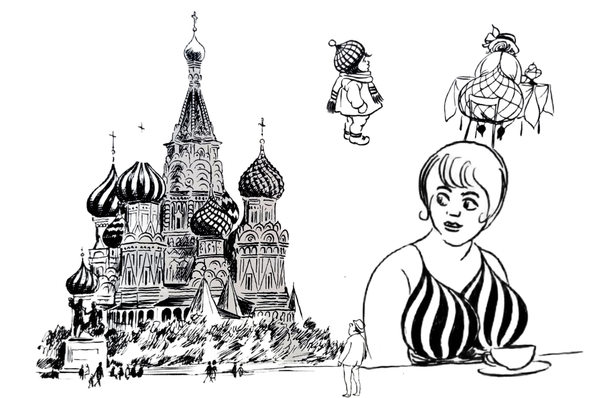 Очень, конечно, заметно, что Херлуф Бидструп пребывал в СССР продолжительное время и без супруги. «Совершенно феноменально здание храма Василия Блаженного, — оправдывается он в подписи к этому рисунку. — Насмотревшись на его разноцветные луковичные купола, видишь их потом целый день повсюду».