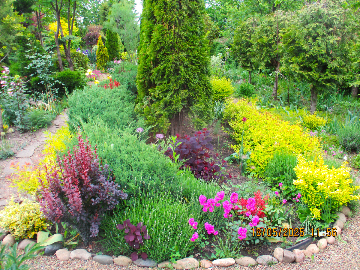 Разные сорта можжевельников, жёлтый пузыреплодник , скумпия "Фоллис Пурпуреус". Справа бузина и можжевельник. Цветут ирисы.
