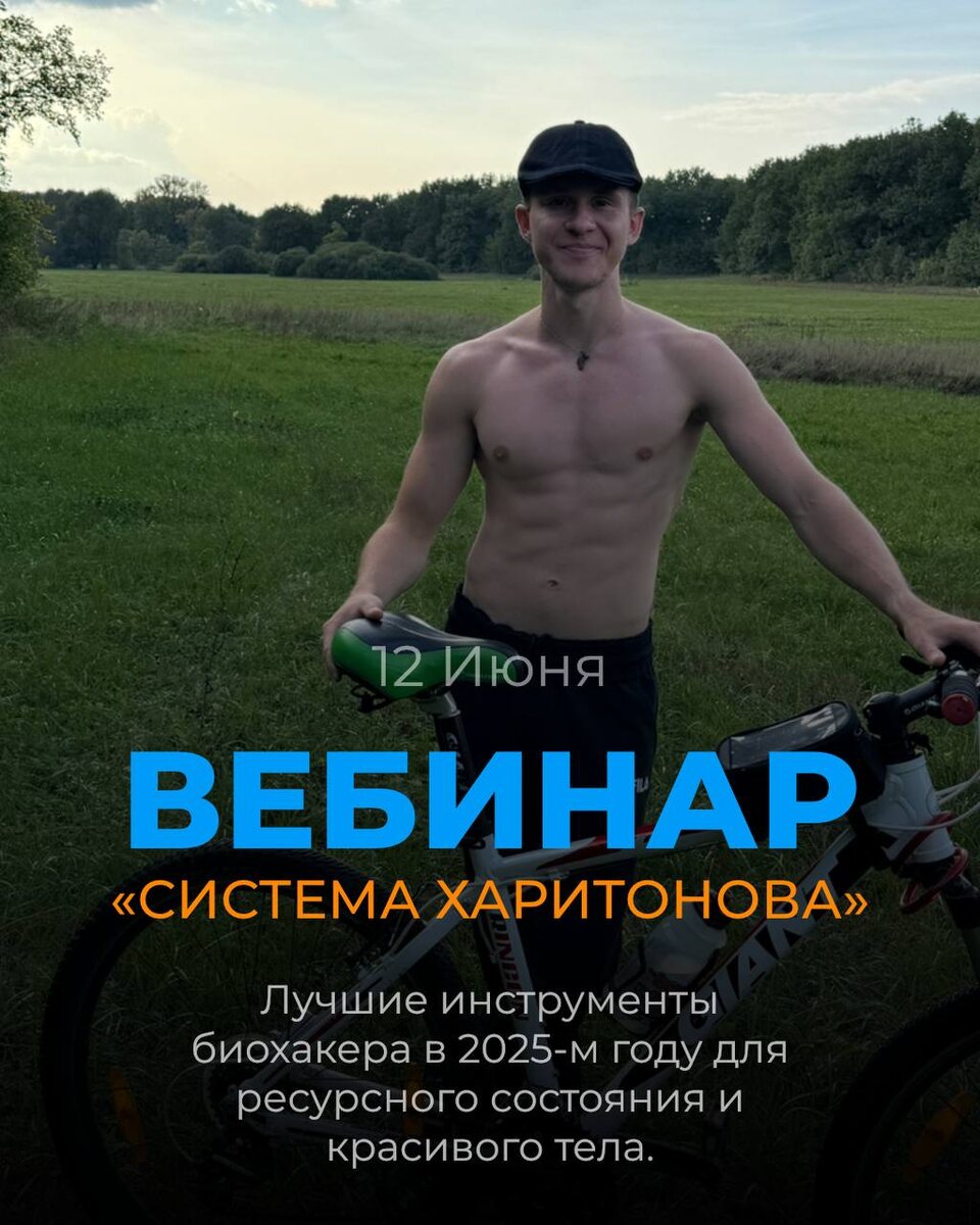 А 12 Июня я провожу единственный вебинар этого лета: Тема: Система Харитонова. Самые актуальные инструменты биохакера, для Ресурсного состояния и красивого тела, в 2025 году! В этот день, я открою продажи на обучение, по самым вкусным условиям! Единственный поток этого полугодия. Бронируйте этот день! Следующий поток будет не скоро)