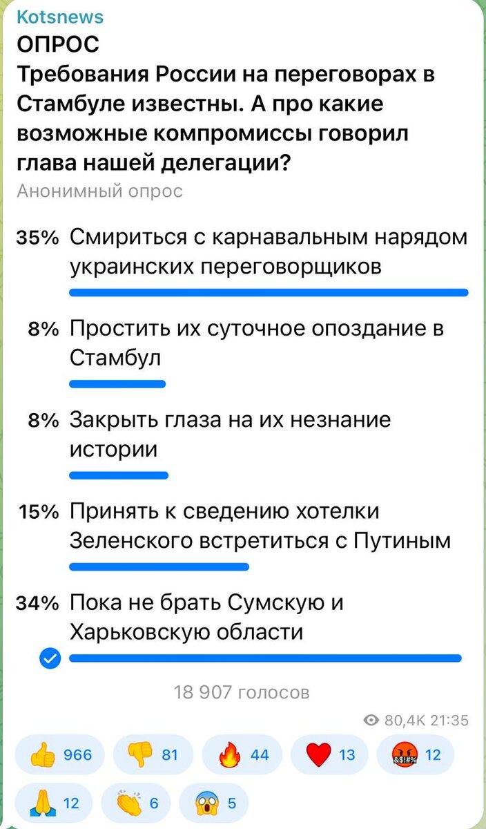 ⚡️⚡️⚡️ 35 процентов проголосовавших считают, что можно смириться с карнавальными нарядами украинской делегации. 34 процента - что можно пока не брать Харьковскую и Сумскую области. Оба варианта, в принципе, рабочие.