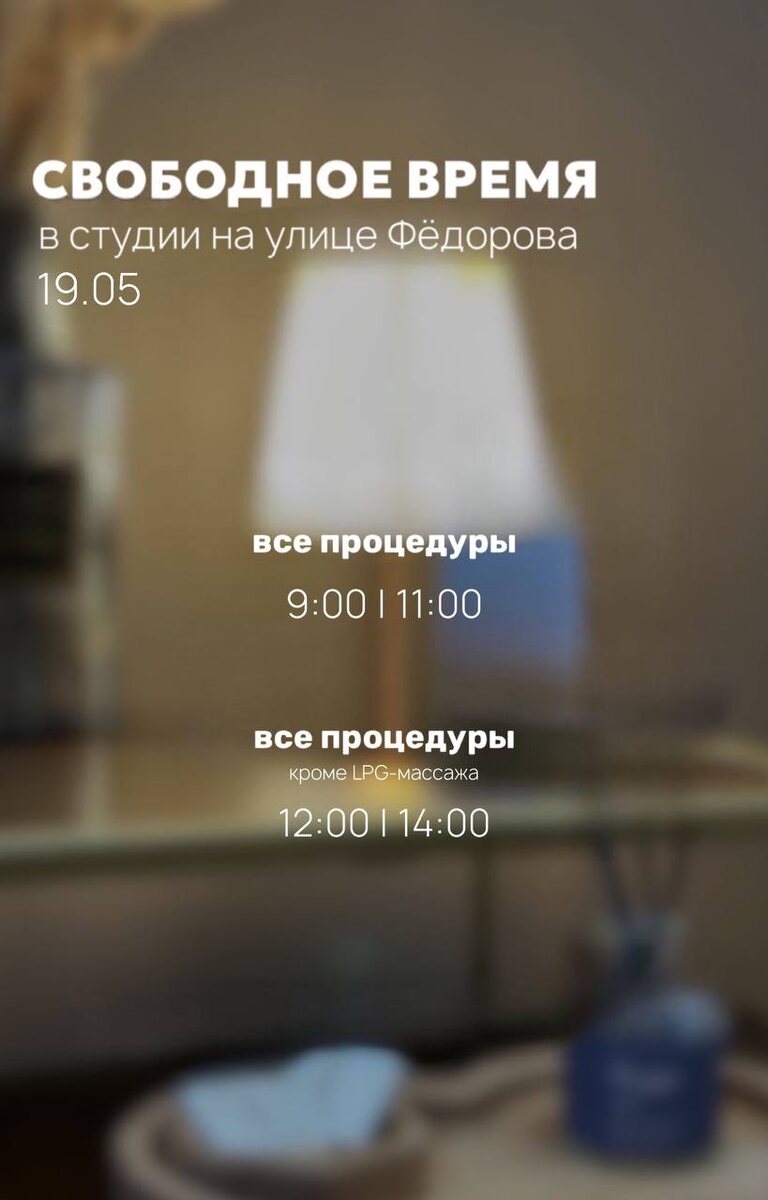СВОБОДНОЕ ВРЕМЯ НА ФЁДОРОВА 19.05 • ONLINE запись • WHATSAPP Ждём вас к нам на процедуры 🤍