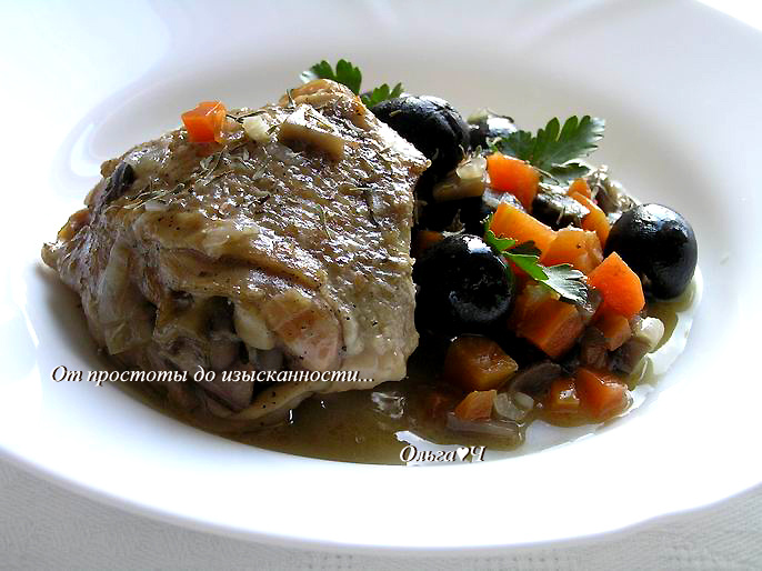 Всем доброго дня! Сегодня Православная церковь празднует перенесение мощей святителя Николая Чудотворца в Бари. С Праздником! А перед вами ароматная курочка во французском стиле с овощами, грибами и маслинами, томленная в белом вине. Попробуйте! Ингредиенты: 4 куриных бедра