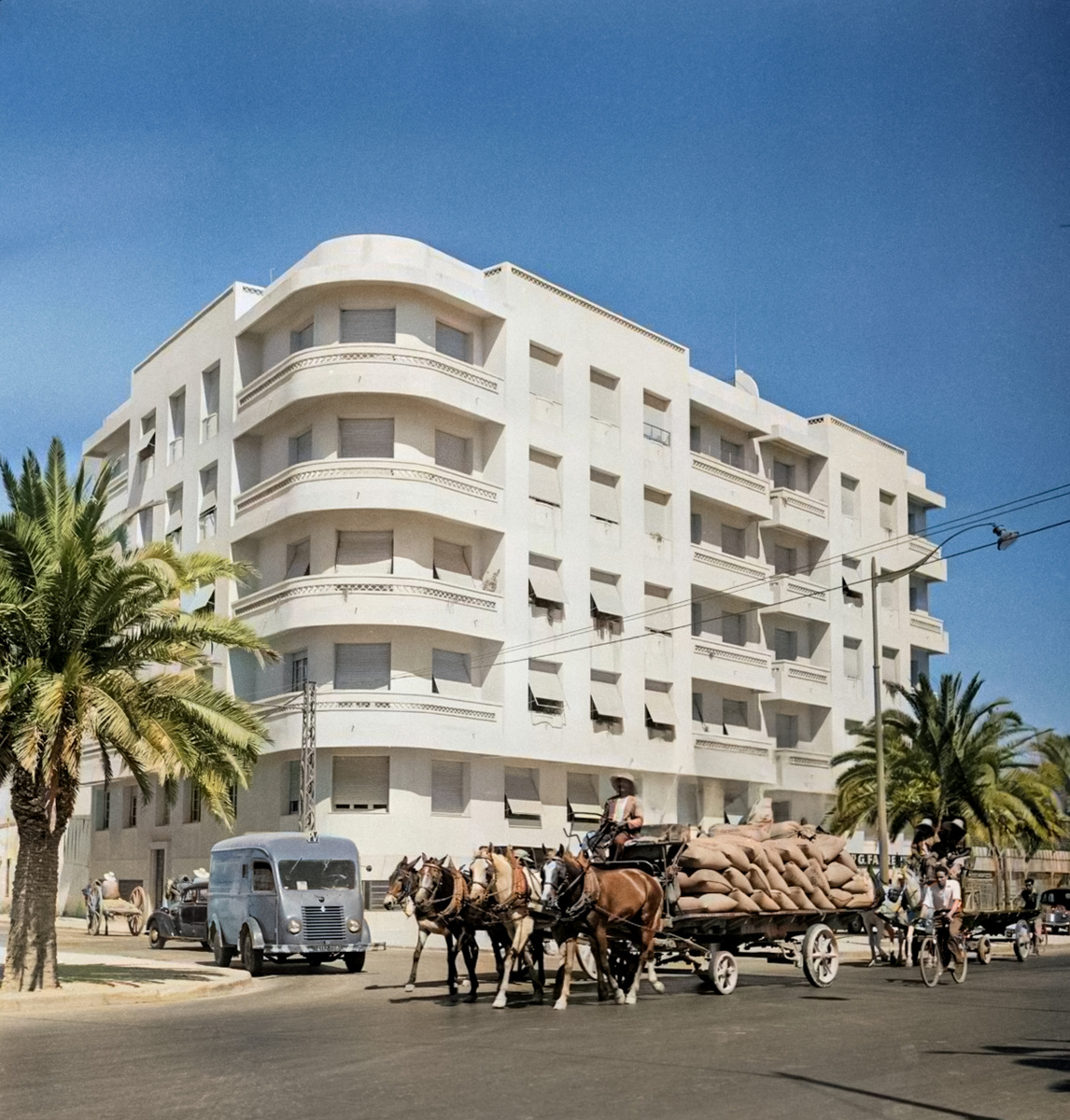 Фермер на конной повозке едет по авеню Гамбетта перед современным зданием в столице Туниса, 1950 год.