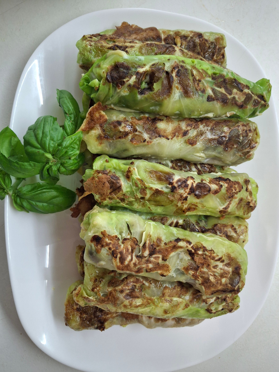 Состав: Приготовление: Качан капусты делим на листья. Я брала молодую, маленький кочан. Листья опускаем в кипящую воду на 2-3 минуты, не перевариваем. Варим по несколько штук сразу. Достаём, выкладываем на тарелку, даём стечь. Из картофель чистим, варим, делаем пюре. Мелко нарезанный лук обжариваем на сковороде с 1-2 ст.л. масла подсолнечного. Когда лук станет прозрачным, через 2-3 минуты, добавить мелко нарезанные шампиньоны. Жарим до готовности (что бы лишняя влага испарилась), соли перчим. Готовим начинку. Смешиваем картофельное пюре, жаренные грибы с луком, мелко нарезанную зелень и сыр натёртый на мелкой тёрке. Если жила на листе капусты большая, срезаем её. Лист раскладываем на тарелку, выкладываем ложку начинки и сворачиваем трубочкой, а концы заворачиваем внутрь. Если с концов остаётся сильно много капусты, можно подрезать. Разогреваем сковороду, смазываем маслом. Яйцо взбиваем. Обваливаем «голубцы» -рулеты в яйце и выкладываем на сковороду. Обжарим на среднем огне, с