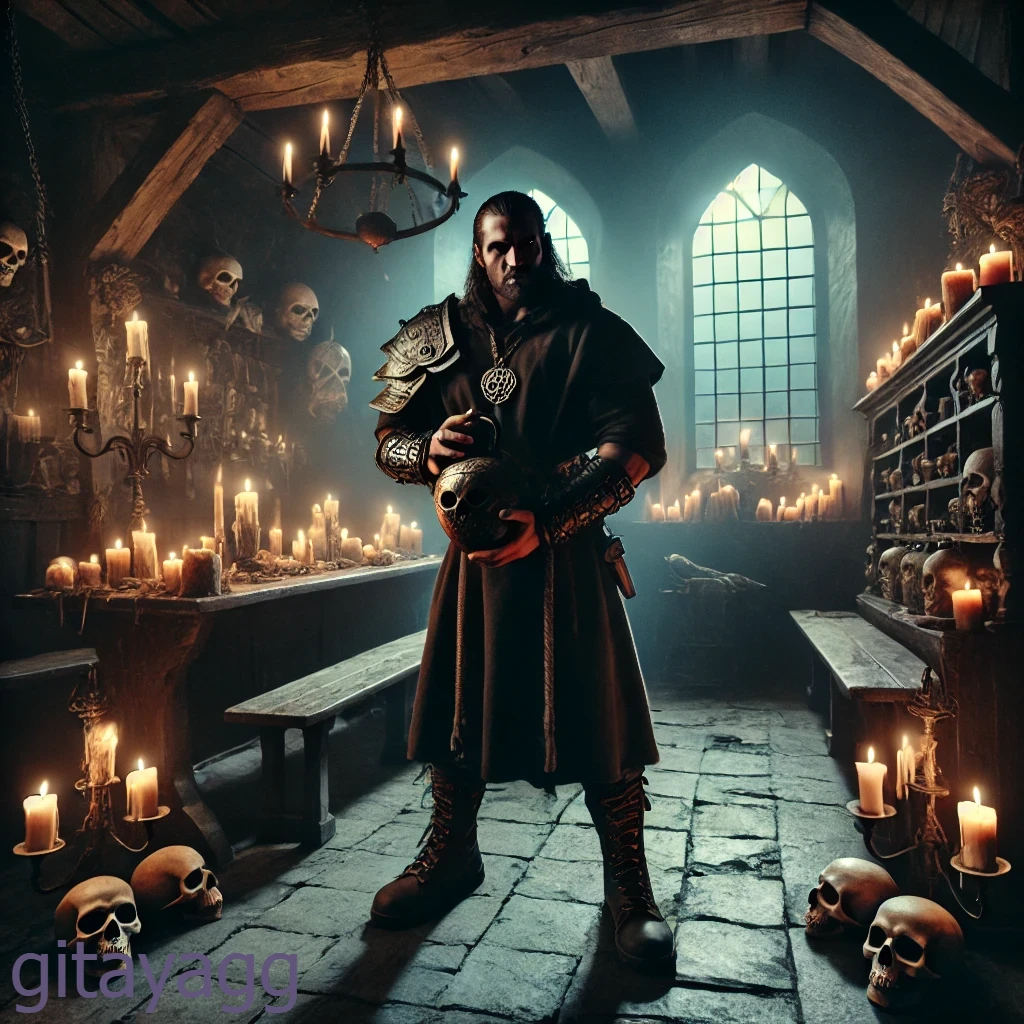 Монашеская ряса, из-под которой виднелись тяжёлые берцы, длинные волосы, забранные в пучок, на груди - ярко сияющие в свете свечей серебряные доспехи. Он был бы очень похож на персонажа из компьютерных игр, если не бешенный взгляд беспощадных ярко зелёных глаз.