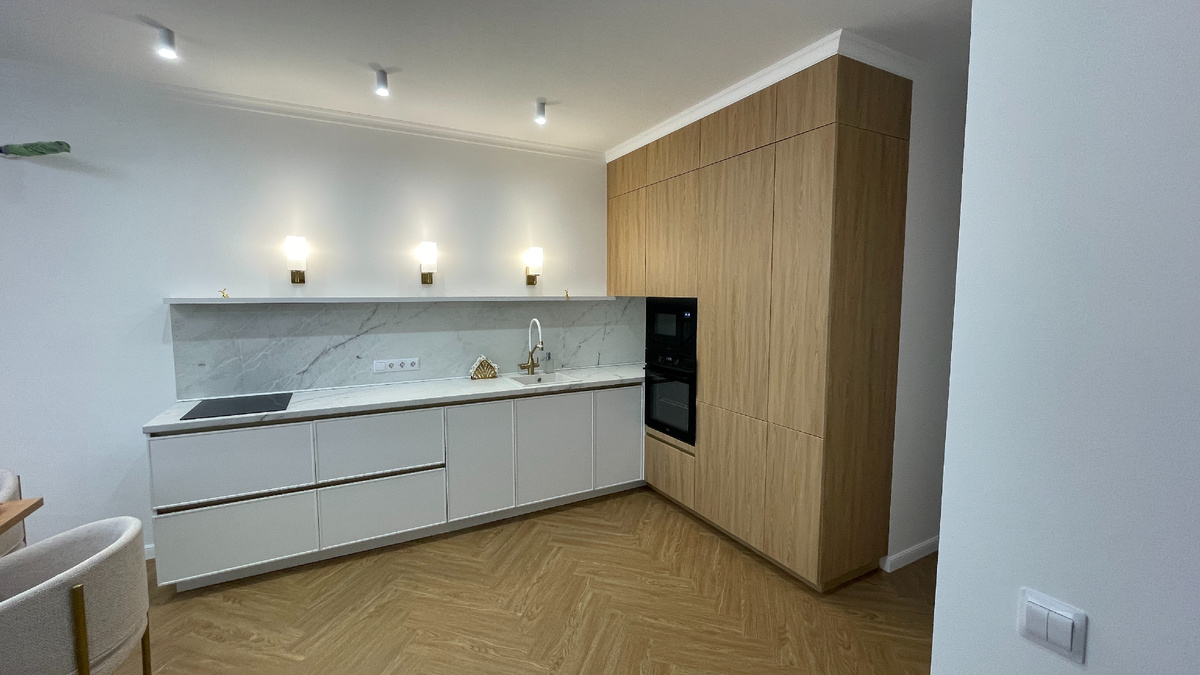 Кухня в стиле джапанди — это идеальное сочетание японской философии уюта и скандинавской сдержанности. Такой интерьер создаёт атмосферу покоя, уюта и визуального порядка. Если вы ищете идеи для современной кухни в квартире или частном доме — обратите внимание именно на стиль джапанди. На фото — современная кухня в стиле джапанди, выполненная на заказ. В ней собраны ключевые элементы этого трендового дизайна: На фото — современная кухня в стиле джапанди, выполненная на заказ. В ней собраны ключевые элементы этого трендового дизайна: Фасады под дерево и столешница с мраморной текстурой — это популярные решения для тех, кто хочет заказать натуральную кухню на заказ в стиле джапанди. Они создают уют и при этом долговечны в использовании. Система «без ручек», ровные линии, встроенная техника — всё это делает кухню не только красивой, но и максимально удобной. Такой подход особенно актуален при дизайне кухни в современном стиле. Мягкий тёплый свет от настенных бра придаёт интерьеру теплоту.