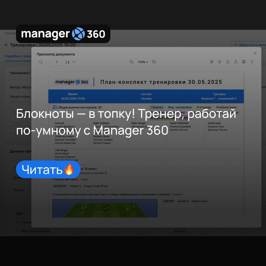 Пора признать — это прошлый век. Мы написали честный и бодрый текст о том, почему Manager 360 — это лучшее, что может случиться с тренером, который устал теряться в бумажках. 🧠 Конспекты 📋 Составы ✅ Посещаемость 📊 Статистика 🖨️ PDF для печати — всё в одном месте. Без хаоса. Без "а где я это записывал?" 👉 Прочитай и проверь, сколько времени ты уже теряешь зря: https://wiki.manager360.pro/ru/home/m360-blog/training-notes-19-5-25