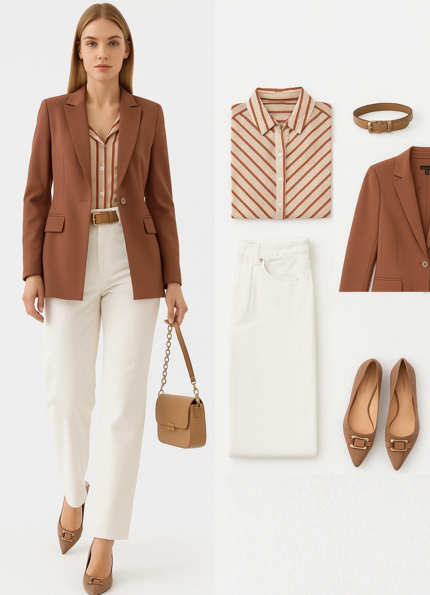 🎯 Современная классика🎯 🔗 Ссылки на вещи: 🧥 Жакет терракотового цвета — добавляет образу чёткости и элегантности, отлично сидит по фигуре и подчёркивает талию. Универсальная база для любого гардероба! 👚 Полупрозрачная рубашка в диагональную полоску — дышащий материал и оригинальный крой делают её акцентной вещью. Лёгкий бохо-флер и винтажная эстетика в одной детали. 👖 Широкие джинсы — свободный крой создают ощущение простора и непринуждённости. Комфорт на весь день! 👜 Сумка в тёплом бежевом оттенке с цепочной ручкой — лаконичная и стильная, дополнит любой образ. Металлические акценты добавляют немного дерзости. 👠 Замшевые туфли на устойчивом каблуке — женственные и утончённые. Нежный цвет и декоративная пряжка завершают ансамбль с ноткой парижского шарма. 🔁 Кожаный ремень карамельного оттенка — финальный штрих! Поддерживает цветовую гамму и делает образ гармоничным. 💵 Стоимость образа ≈ 30 000 ₽ #городскаяэстетика_looksmania #осознанныйстиль_looksmania #классикавгороде_l