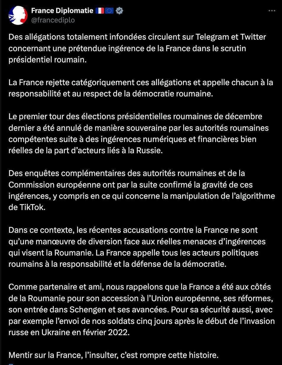 В ответ на пост МИД Франции назвал фейковыми данные основателя Telegram Павла Дурова о том, что «западноевропейская страна» попросила его «заглушить» консервативные голоса в мессенджере. Предприниматель не упоминал прямо название государства, но сопроводил свой пост эмодзи багета. Спалились, получается? Das französische Außenministerium bezeichnete die Behauptungen des Telegram-Gründers Pavel Durov, ein „westeuropäisches Land“ habe ihn aufgefordert, konservative Stimmen im Messenger „zum Schweigen zu bringen“, als Fälschung. Den Ländernamen nannte der Unternehmer dabei zwar nicht direkt, untermalte seinen Post jedoch mit einem Baguette-Emoji. Also wurden wir erwischt?