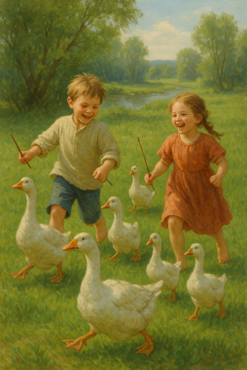 Дети шли босиком по траве. В руках хворостинки. Они гнали гусей с речки. Гусаки шагали важно, подняв высоко головы. А гусыньки двигались вперевалочку, пригнувшись к гусятам и время от времени тихонько щипая их, если те подбирали что-нибудь негодное с земли. Порой какой-нибудь гусак останавливался, оборачивался назад, вытягивал шею и угрожающе шипел, мальчик махал на него веткой и кричал:
