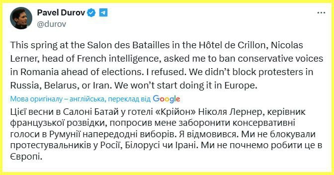 👀 Глава французской разведки просил меня заблокировать консервативные голоса в Румынии перед выборами, – Павел Дуров. «Я отказался. Мы не блокировали протестующих в России, Беларуси или Иране – и не начнем делать это в Европе». В МИД Франции попытки повлиять на блокировку каналов в Румынии отрицали.