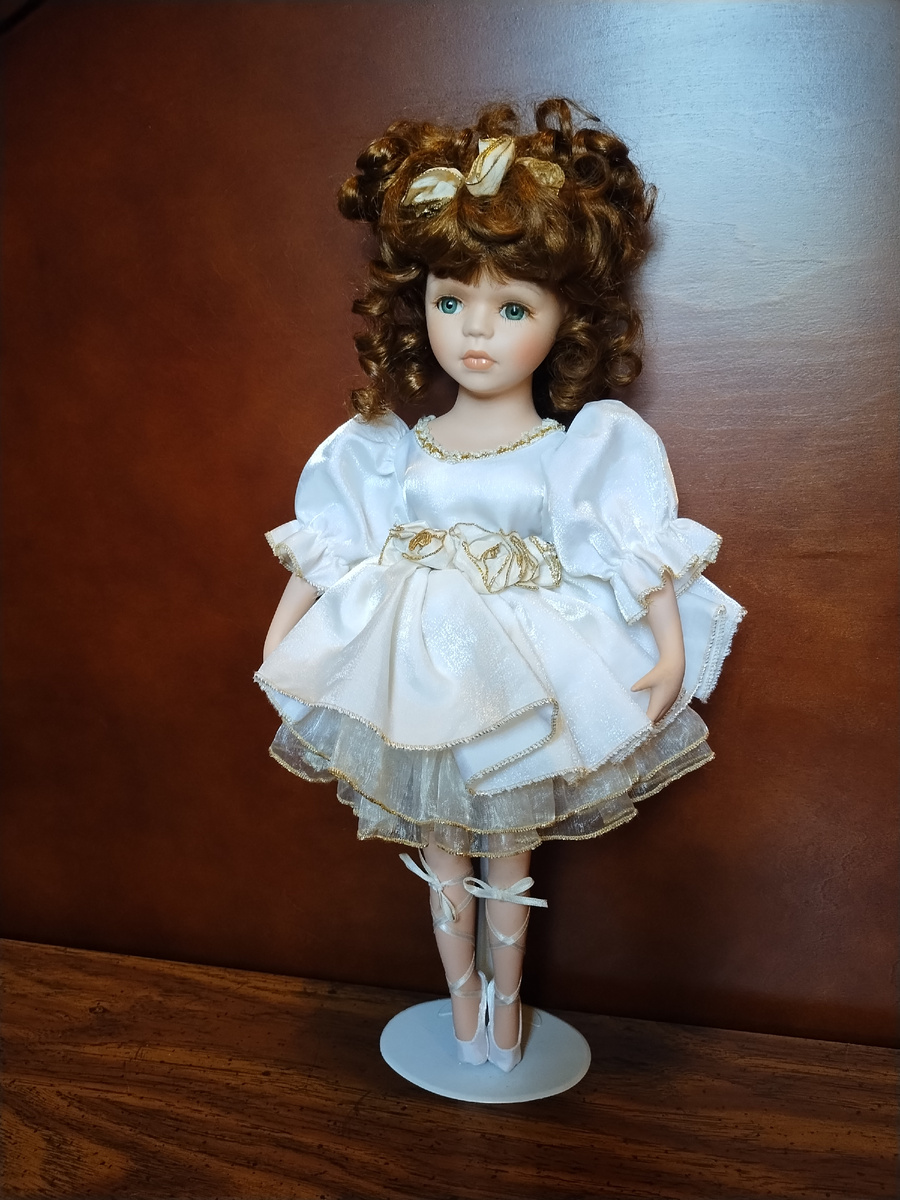 Это кукла- Балерина. Она одета в очень красивое платье - пачку, белого цвета, на ножках пуанты. Волосы собраны и заколоты в стандартной причёске балерины. Прическа дополнена цветами роз. Кукла выполнена в специфичной позе балерины- стоит на пуантах, показывая какое то стандартное па. У нее красивое выразительное лицо, зелёные глаза, обрамлённые пушистыми ресницами.