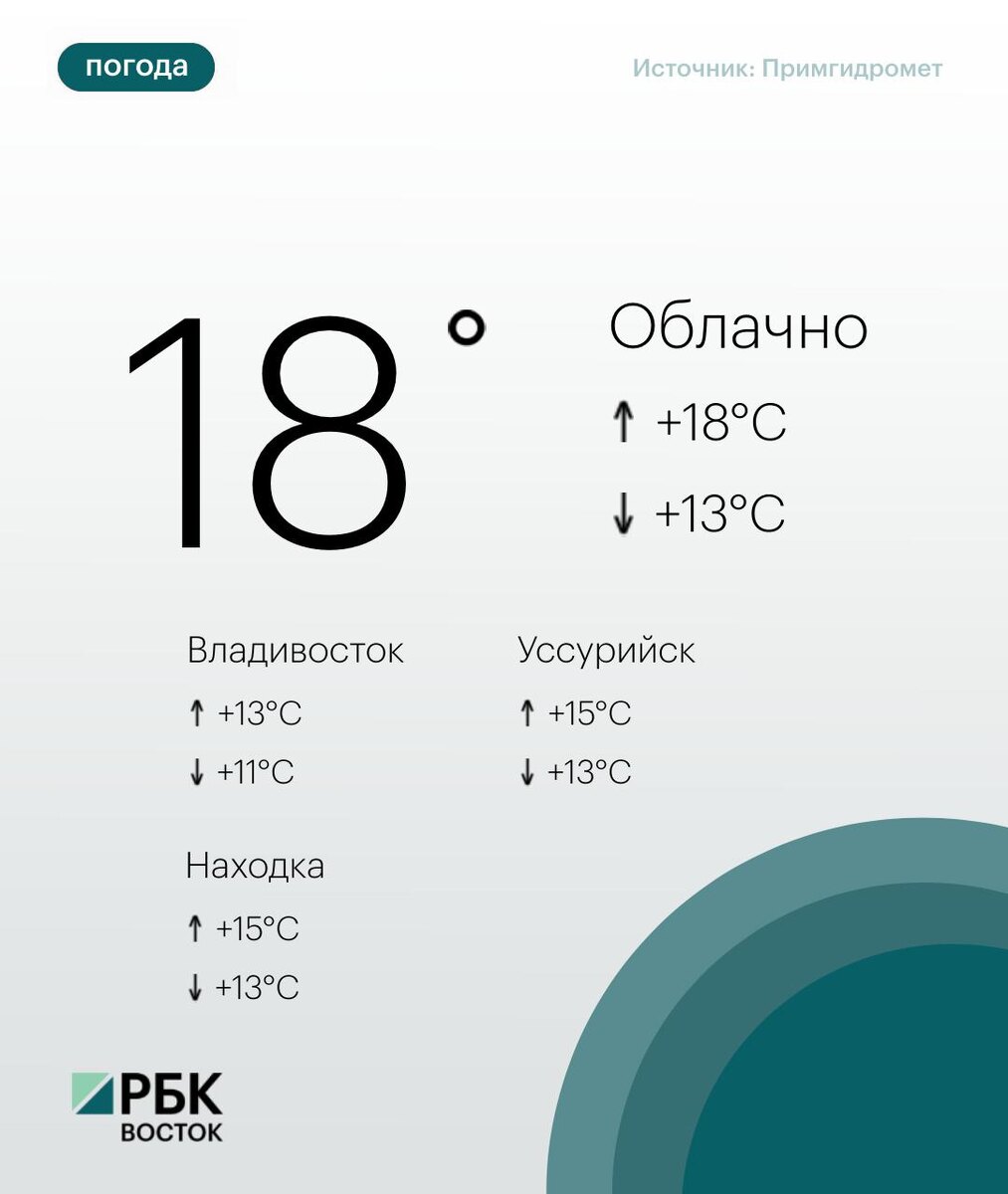 Сегодня погоду в Приморье определяет поле пониженного атмосферного давления. Днем небольшой, местами умеренный дождь, гроза. Ветер юго-западный умеренный, днём до сильного. Температура воздуха +13...+18°C 🌧 Во Владивостоке облачно. Днем временами дождь, возможна гроза. Ветер юго-западный, южный умеренный до сильного, вечером сильный. Температура воздуха +11...+13°C. 🍱Подписывайтесь на РБК Восток