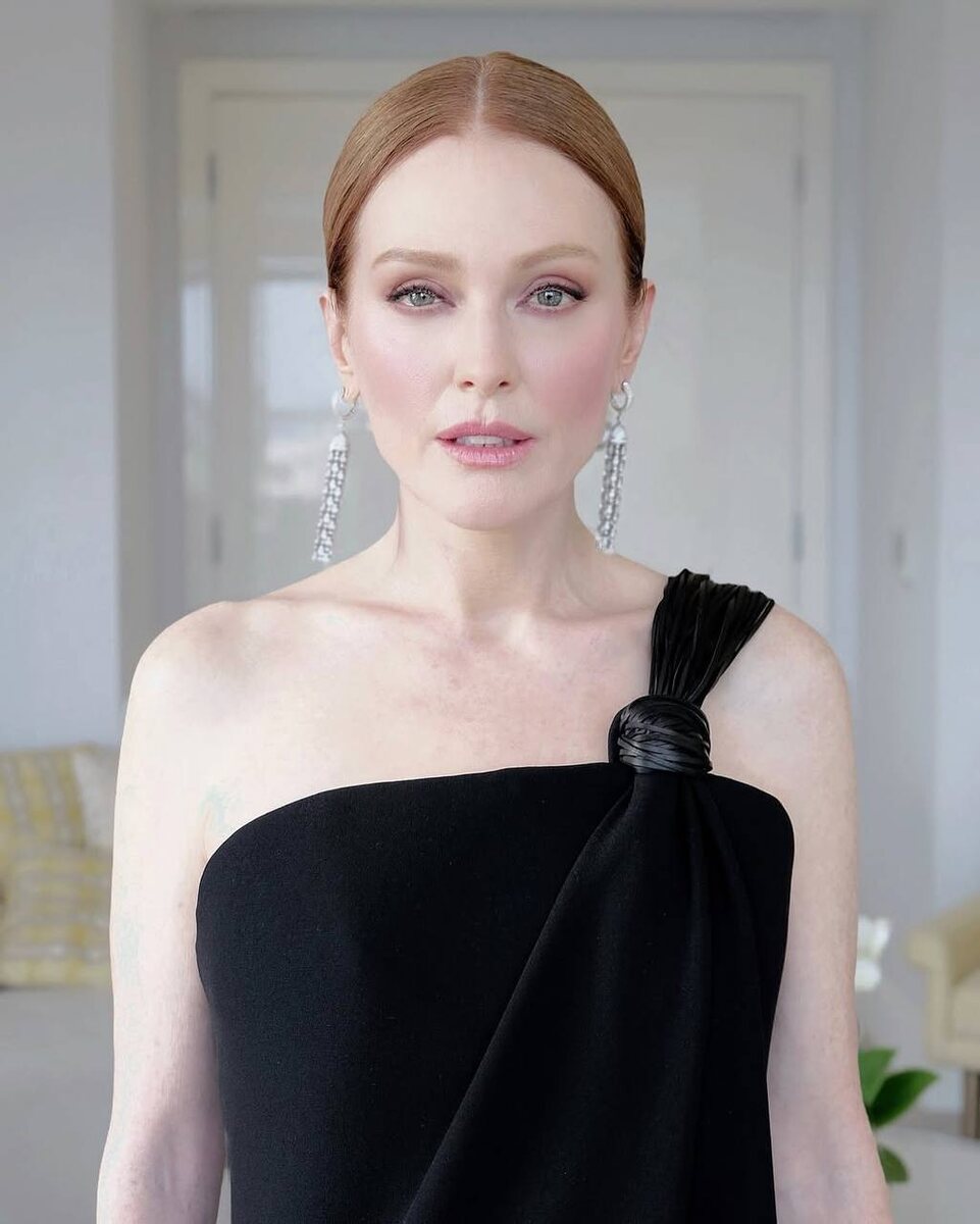 — Джулиана Мур в первом образе Луиз Троттер для Bottega Veneta. Украшения — Boucheron. Стилизовала Кейт Янг. Только взгляните на этот кожаный узел с бахромой.