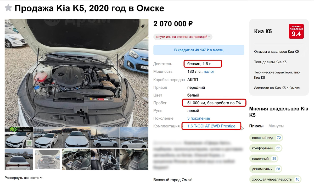В интернете мы нашли объявление KIA K5 без пробега по России по очень хорошей цене – 2 070 000 рублей. Бензин, 1.6 турбо, небольшой пробег - всего 51 000 км. Комплектация - престиж! Автомобиль выкуплен и уже готов к отправке в Россию.