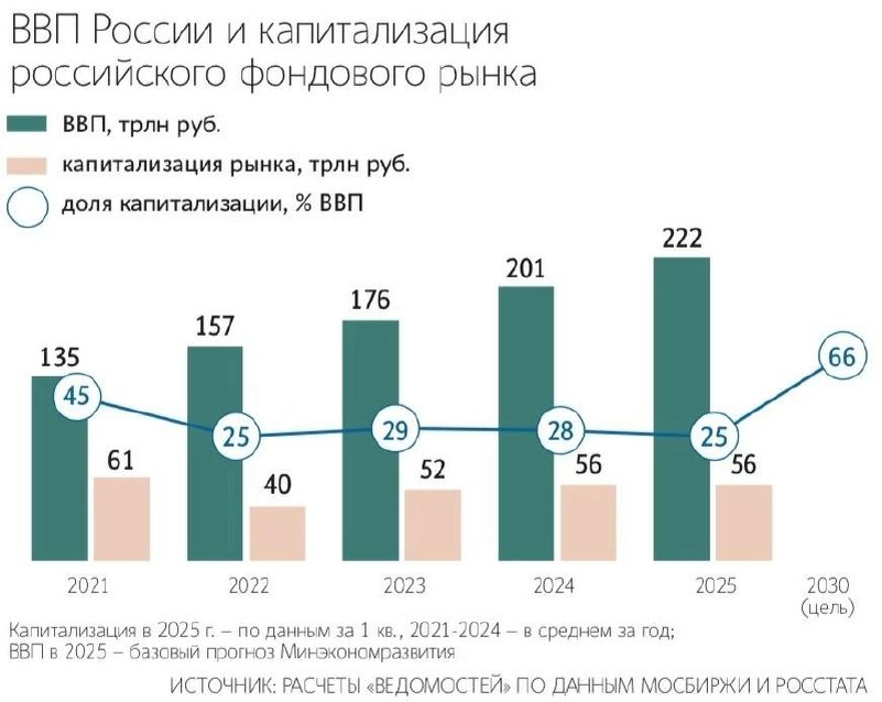 🪖 Для достижения цели в 66% от ВВП к 2030 году рынок капитала РФ должен вырасти на ₽7–9 трлн — ЦБ РФ Необходимо преодолеть исторический перекос в сторону банковского кредитования при привлечении финансирования и возобновить IPO и SPO. 🔵Для устранения перекоса Банк России договорился с правительством — господдержка будет распространяться и на проекты, финансируемые через фондовый рынок.
