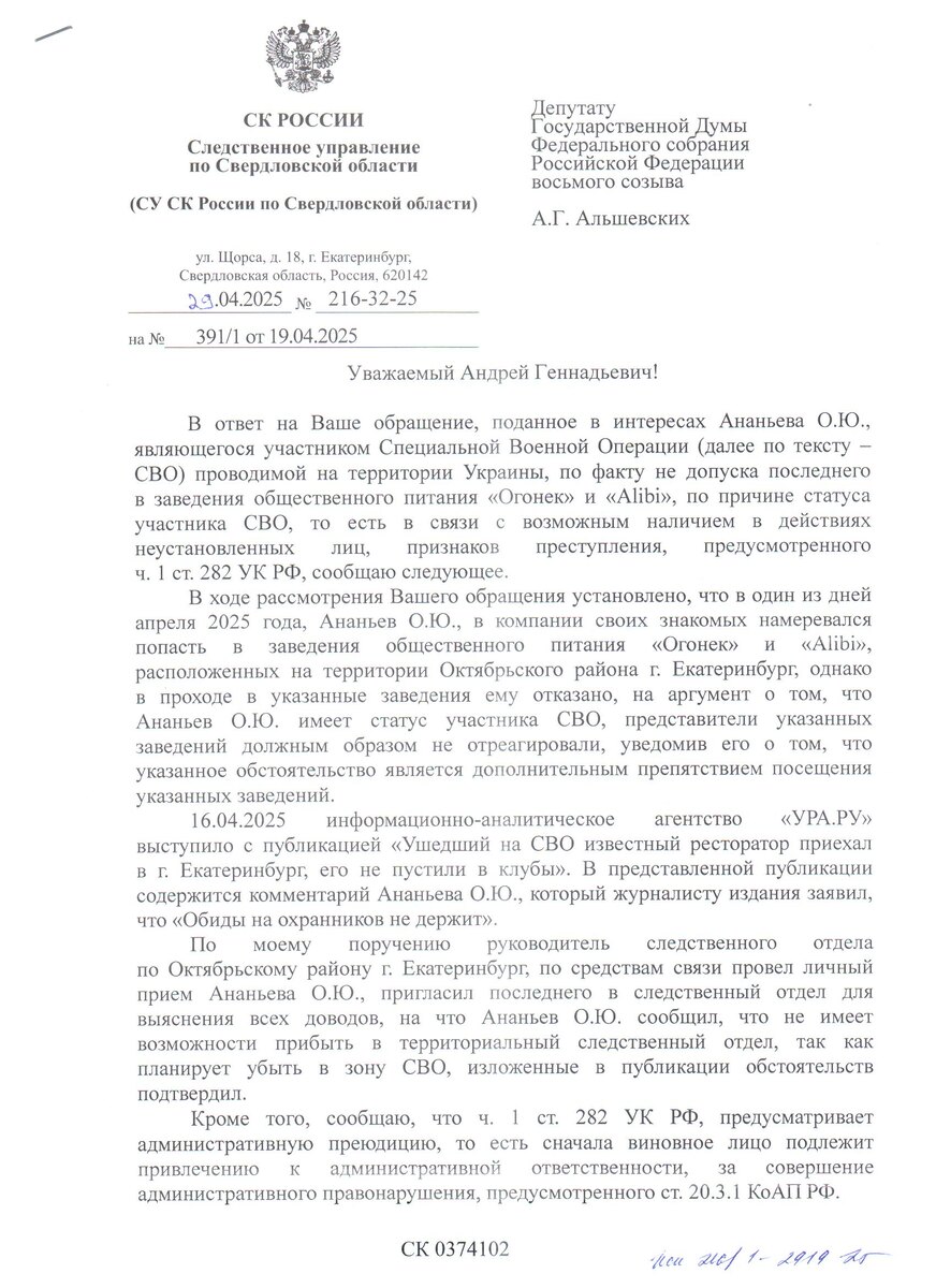 В двух барах Екатеринбурга охранники отказали во входе участнику СВО и по совместительству некогда известному ресторатору. Якобы потому, что он был в форме. Причина, мягко говоря, странная и сомнительная. Выглядит как сегрегация… Учитывая, что других подробностей конфликтной ситуации нет, попросил правоохранителей разобраться. На данный момент что Следком, что прокуратура поручили проверку региональной полиции.