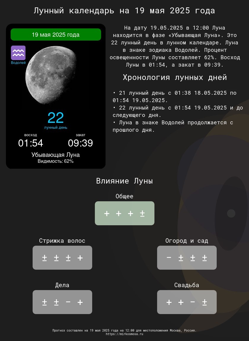 🔹🌗 Лунный календарь на 19 мая 2025 года — Что приготовила Луна? Подробнее