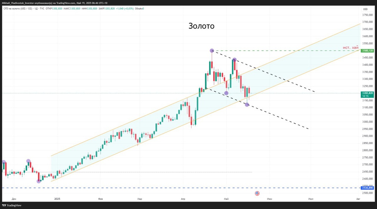 МЕТАЛЛЫ Золото GOLD $GDM5 Таймфрейм дневной Расторговывается в нисходящем боковике. Максимумы и минимумы понижаются.Довольно агрессивные продажи присутствуют в левой части графика. Вполне допускаю, что можем увидеть отскок выше и потом добивание минимумов. Я бы так же обращал внимание на рынок США. Если будем продолжать рост по S&P500, то золото с большей вероятностью будет снижаться. Как мы знаем золото защитный актив и обычно перелив средств идет при падении рынков. Платина $PTM5 Таймфрейм дневной Расторговываемся в боковике. После таких агрессивных продаж я бы искал только инвестиционные покупки через бессрочные контракты. Ну а для спекуляций необходимо выходить выше 1040 и закрепляться. Пока так... Палладий $PDM5 Таймфрейм дневной В левой части графика агрессивные продажи(стрелкой показал). Пока находимся внутри них, продолжаем искать шорты. Если покупки, то только инвестиционные. Серебро $SVM5 Таймфрейм недельный Очень агрессивные продажи прошли в серебре. После таких прод
