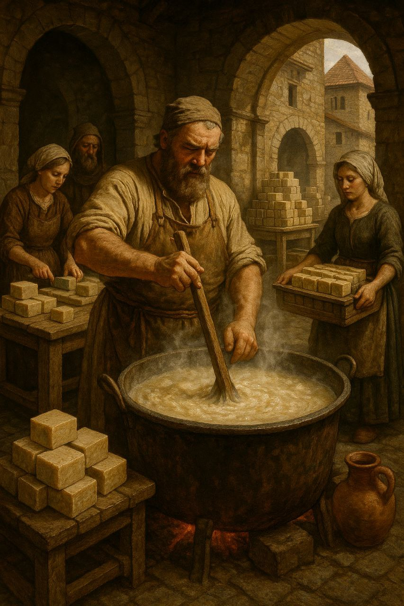 Вторым главным компонентом является щелочь, которую в Средние века получали при сжигании различных растительных материалов. В Испании нашлось отличное растение с большим содержанием натрия – солянка содоносная. В сочетании с местным оливковым маслом оно обеспечило хорошее качество мыла, которое при варке всплывало на поверхность, оставляя щелочь, растительную окраску и примеси оседать.