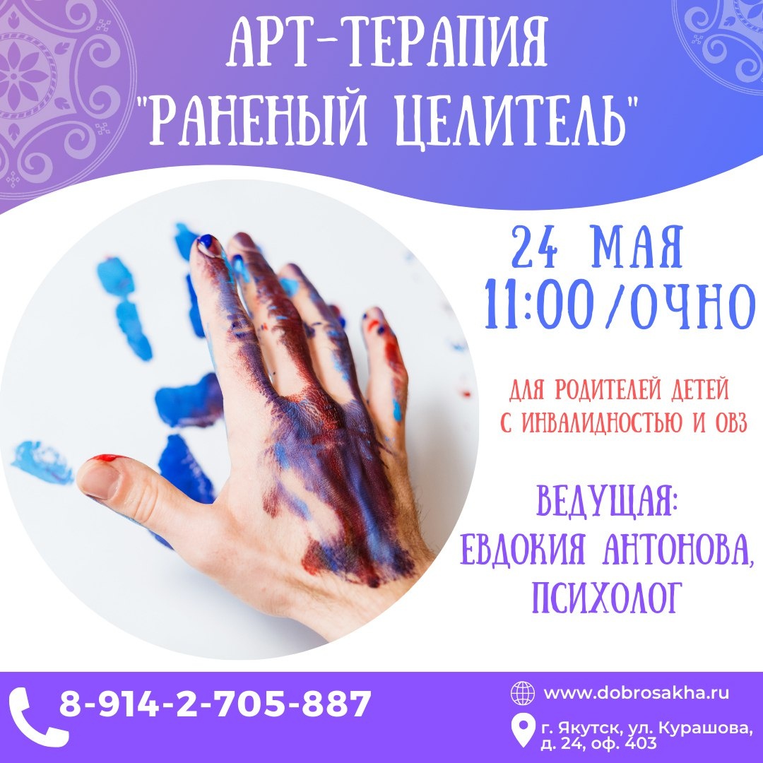 🎨Приглашаем родителей 24 мая (суббота) на арт-терапию «Раненый целитель» 💖 Каждый родитель особенного ребенка является «целителем»: как поддержать себя в своем целительстве будем разбирать на встрече с психологом фонда. 👩🎨 Ведущая: психолог Евдокия Антонова 🎯 Дата: 24 мая с 11:00 ч. 🏢 Место проведения: офис БФ «Харысхал», Курашова 24 каб 403 🔗 Запись по ссылке: https://bf-kharyskhal.timepad.ru/event/3373004/ 📲Телефон "Службы заботы": 8914-2-705-887 #ЗаписьХарысхал