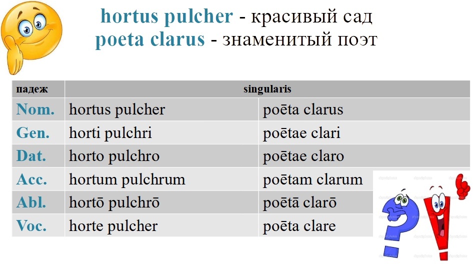 Мужской и средний род прилагательных, женский род которых изменяется по первому склонению, склоняется по второму склонению. В Nom. sing. у них окончания -us, -er, -um: amicus, puer, otium. Как у существительных мужского рода на -er при склонении е исчезает, но есть исключения: Помните, что прилагательное согласуется с существительным не по форме, а по роду. Например, poeta clarus - знаменитый поэт, poeta, ae m - изменяется по первому склонению, но имеет мужской род, поэтому к нему берем форму прилагательного мужского рода - clarus. Прилагательные могут превращаться в существительные (субстантивироваться). Чаще всего это происходило с прилагательными среднего рода: verus, a, um - истинный и verum, i n - истина; bonus, a, um - добрый и bonum, i n - добро; asper, a, um - трудный и asperum, i n - трудность, преграда.