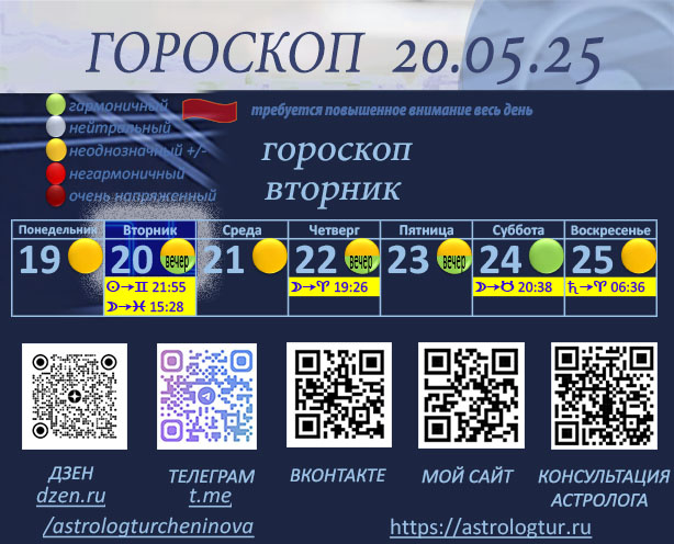 Также сегодня кульминация благоприятного аспекта Солнца с Сатурном (кульминация аспекта 20.05.25, влияние минимум с 18.05.25 по 23.05.25). Эта энергия поддержит нас, поможет довести дела до конца и получить нужный результат. Этот аспект способствует обретению устойчивости, стабильности и уверенности. Благодаря ему мы можем сосредоточиться, реально оценить ситуацию и отделить главное. Это время (период влияния этого аспекта) благоприятно для принятия взвешенных решений, начала или успешного завершения сложных проектов, а также для укрепления авторитета в профессиональной сфере. Кроме того, в контексте дня это влияние может проявиться так, что через изменения и перемены мы придём к результату и стабильности.