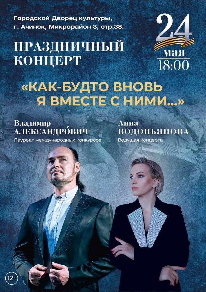Сольный концерт ведущего солиста Красноярского театра оперы и балета Владимира Александровича состоится в Ачинске 🎵🎼 Владимир Александрович лауреата более 20-ти Международных и Всероссийских конкурсов, обладатель премии и звания «Bella Voce» - «прекрасный голос» (Италия), приглашённый солист оперных театров Италии, Франции, Австрии, Германии и многих других. Вместе с ведущей концерта Анной Водопьяновой - экспертом на телевидении, имиджмейкером, руководителем собственной школы стиля «Имиджлаб» в Красноярске, они представят слушателям интереснейшую литературно-музыкальную композицию «Как будто вновь я вместе с ними…», посвящённую 80-летию Победы. В ней прозвучат дорогие каждому из нас и всеми любимые песни о войне: «От героев былых времён», «На безымянной высоте», «Смуглянка», «Тёмная ночь», «Журавли», «Случайный вальс», «День Победы» и многие другие. Написанные в разное время и разными авторами, все они посвящены одному — памяти о героизме русских солдат. Концерт является приношен