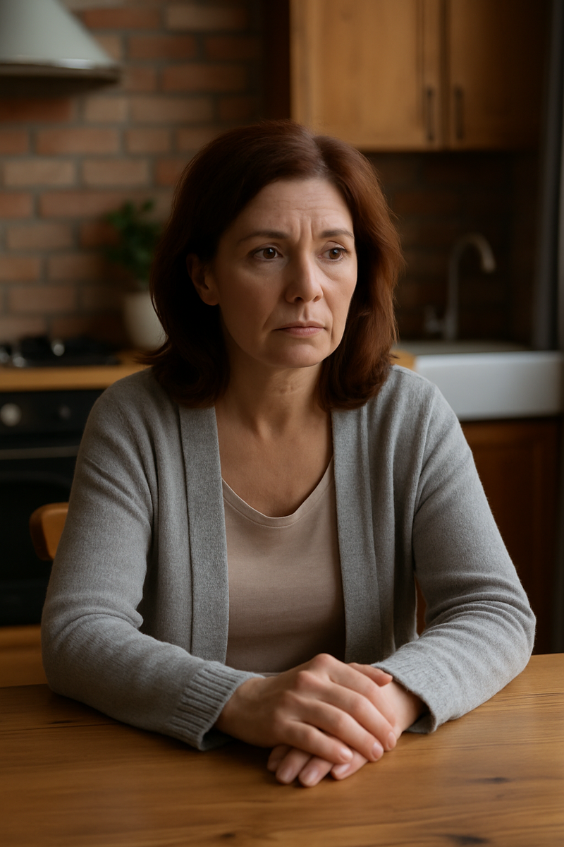 Он пришёл, спокойный, выбритый, как будто ничего не случилось. На ней — серая кофта, усталое лицо и руки, стиснутые под столом. Он не смотрел в глаза.