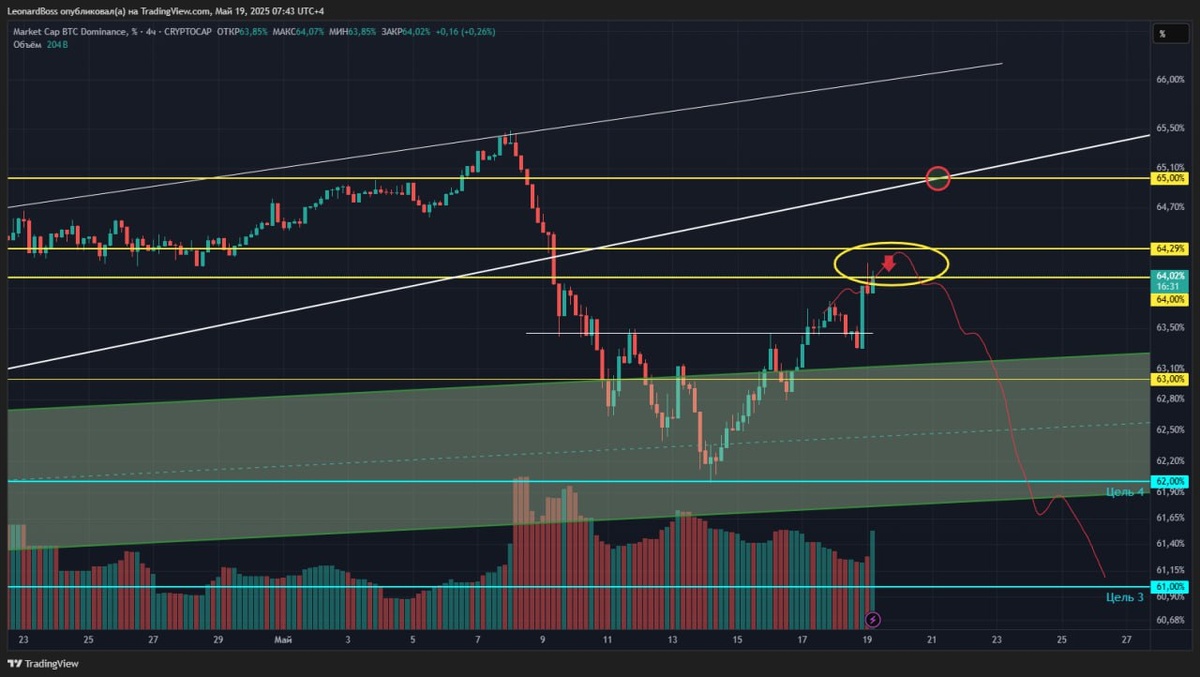 В ответ на пост #BTC 🕯Локально + Глобально🕯 ⚠️Доброе утро, друзья! Началась новая неделя. Начнем с доминации BTC, она всё же пришла в указанную зону и вот именно тут будет решаться, сколько еще нервных дней добавится в ожидание. Если зона сопротивления 64-65% отработает мощно, то 1-2 дня и альта продолжит рост. Если начнется апрельское движение, то можем застрять на текущих уровнях еще на пару недель!! ⚠️Теперь непосредственно к BTC (2й график недельный). Уверен, что вы помните данный график и разметку. Неделя закрылась прекрасно, при этом, закрылась шестая подряд зеленая неделя. Довольно не частое событие, хотя было и восемь в 2023г., после чего биток ушел в 2х месячный боковик, а альты отлично стреляли. Если так, ок, будем рады!! ⚠️Глядя на мощный позитив, мы должны помнить, что HI битка совсем рядом, на расстоянии 3%, чуть выше глобальная трендовая сопротивления, до которой по сути всего 10% роста, что в текущих реалиях уже не вызывает удивления. Если замедлится на корректировк