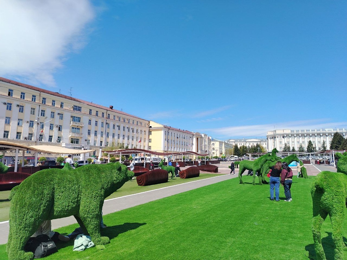 Летняя зона в центре Улан-Удэ. Дети уже успели оседлать зеленые фигурки.