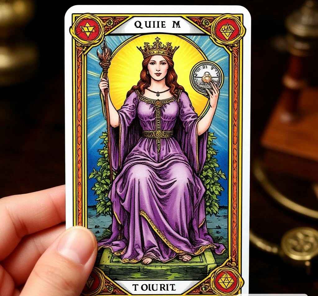 **Королева Пентаклей** символизирует заботливую и практичную женщину, которая умеет создать уют и стабильность в отношениях. Она представляет собой образ матери, которая заботится о своем партнере, принося в их жизнь комфорт и безопасность. В контексте отношений, это может означать, что женщина, с которой он живет, играет ключевую роль в создании гармонии и уюта. Её стремление к материальному благополучию и эмоциональной стабильности может способствовать тому, чтобы партнер чувствовал себя защищенным и вдохновленным.