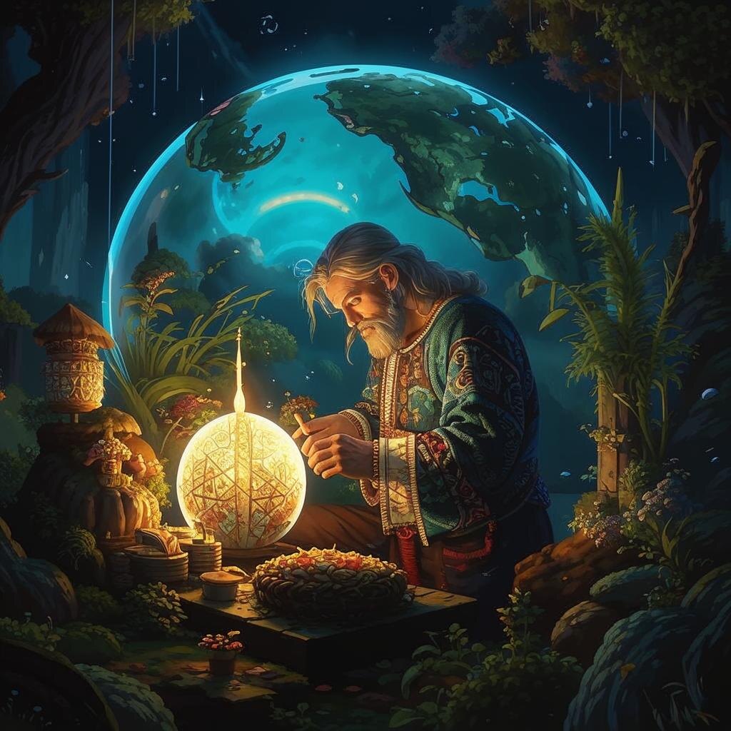 Говорят, в стародавние времена, когда мир был моложе, а границы между Навью, Явью и Правью зыбки, как пар над травами, когда людские воззвания еще достигали Слави и получали отклик, жил человек по имени Владан. Был он не князь и не волхв, не богатый и не знатный, а кузнец-самоук, что жил на краю деревни под лысой горой. Люди звали его Кочаром, ибо частенько уходил он в леса дремучие, к болотам зыбким, и возвращался с железом, неведомым другим кузнецам. Говорили — странное оно, словно живое, само куется. С детства Владан слышал, как ночью в кузнице его деда звенели невидимые молоты, а поутру находил на наковальне узоры, выжженные без огня. Дед говорил: "То — дыхание Ясыни, покровительницы ремесла истинного, что через руки идёт и судьбу кует вместе с железом." Однажды, в Великий день, когда небо было багряным от крови заката, в деревню пришла беда. Из скал вышел древний зверь — Поломар, обличённый медью и гнилью, с горящими глазами, пожирающий тени и кости. Ни мечи, ни стрелы его не бра