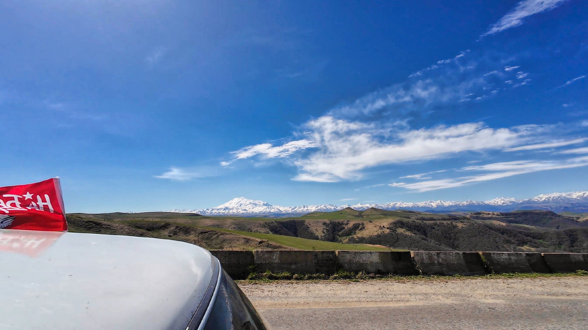 Раньше на 9 мая мы ходили на парад, а потом как то парады отменили, то из-за ненадобности, то из-за пандемии, то из-за погоды и мы придумали себе свою традицию – на машину вешаем флаг, включаем военные песни и едем куда-нибудь в горы! Ходим, читаем памятные таблички, думаем о том, как тут воевали и погибали герои, не позволившие врагу захватить наши земли… Много тут и табличек рассказывающих о зверствах фашистов над мирным населением… В общем, в горах есть о чем подумать. Проезжаем Гумбаши, хребет с Эльбрусом как на ладони!