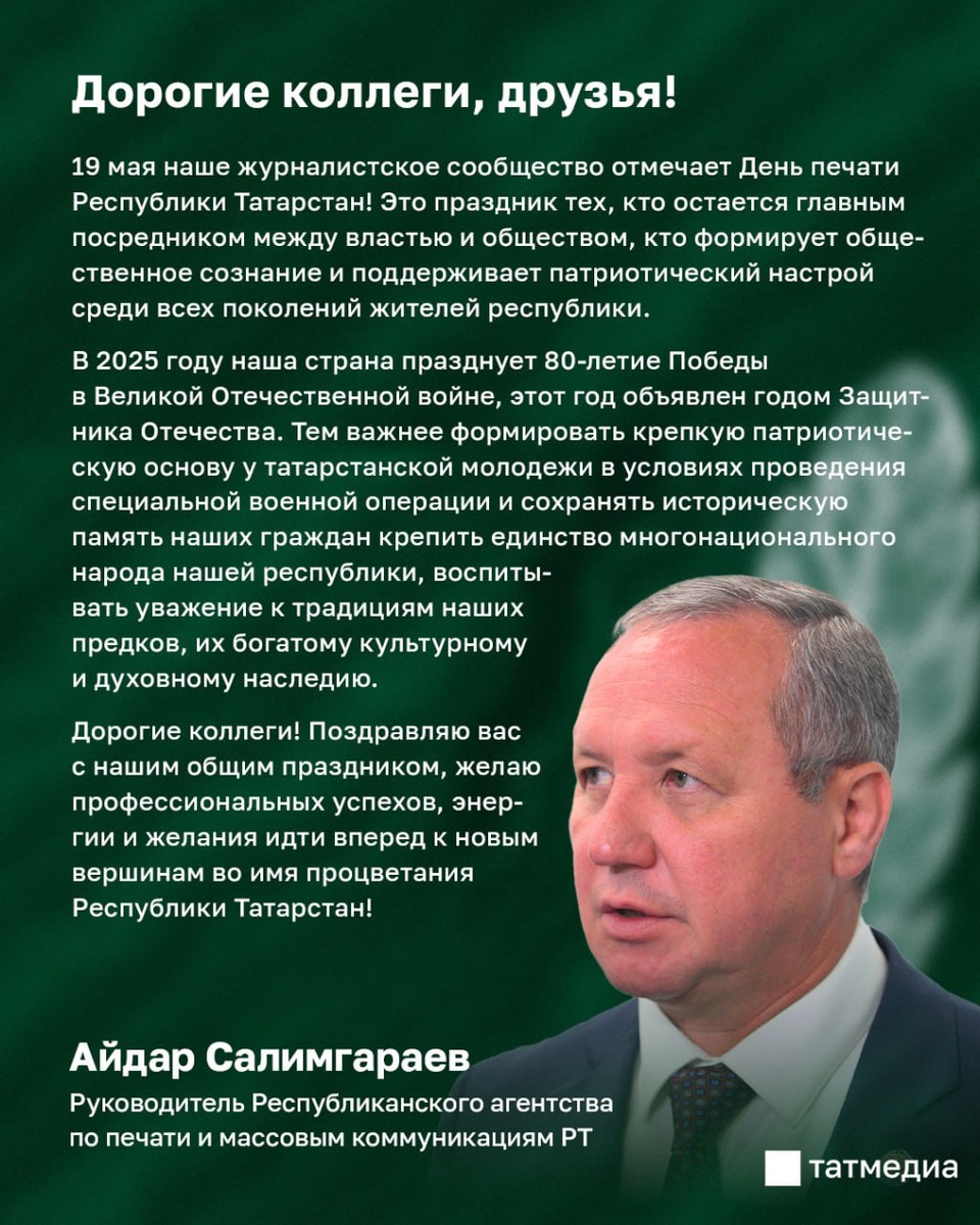 В ответ на пост ™️🪶Руководитель Республиканского агентства по печати и массовым коммуникациям «Татмедиа» Айдар Салимгараев направил поздравление в адрес журналистского сообщества Татарстана по случаю Дня печати, который отмечается 19 мая В своем обращении он подчеркнул важную роль журналистов как главных посредников между властью и обществом, формирующих общественное сознание и поддерживающих патриотический дух среди всех поколений жителей республики. Он пожелал коллегам профессиональных успехов, энергии и стремления к новым достижениям во имя процветания Республики Татарстан. @tatmediaofficial