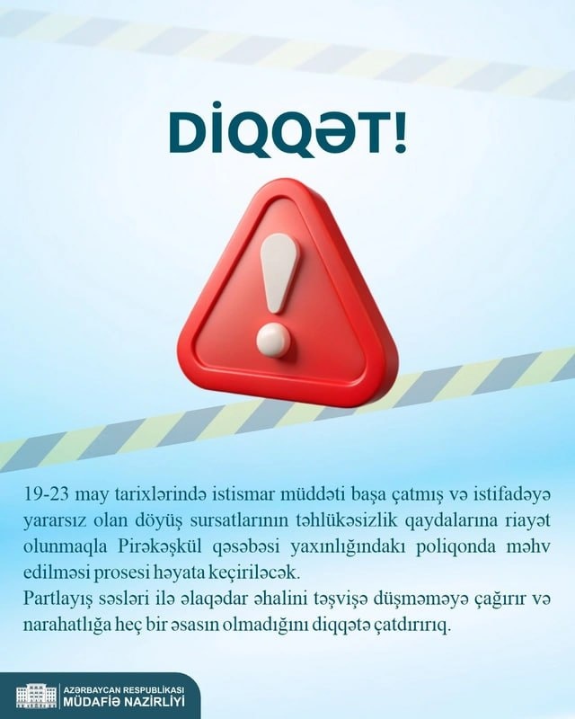 ⚠️ 19-23 мая на полигоне вблизи поселка Пирекешкюль Абшеронского района с соблюдением правил безопасности будет проведена утилизация