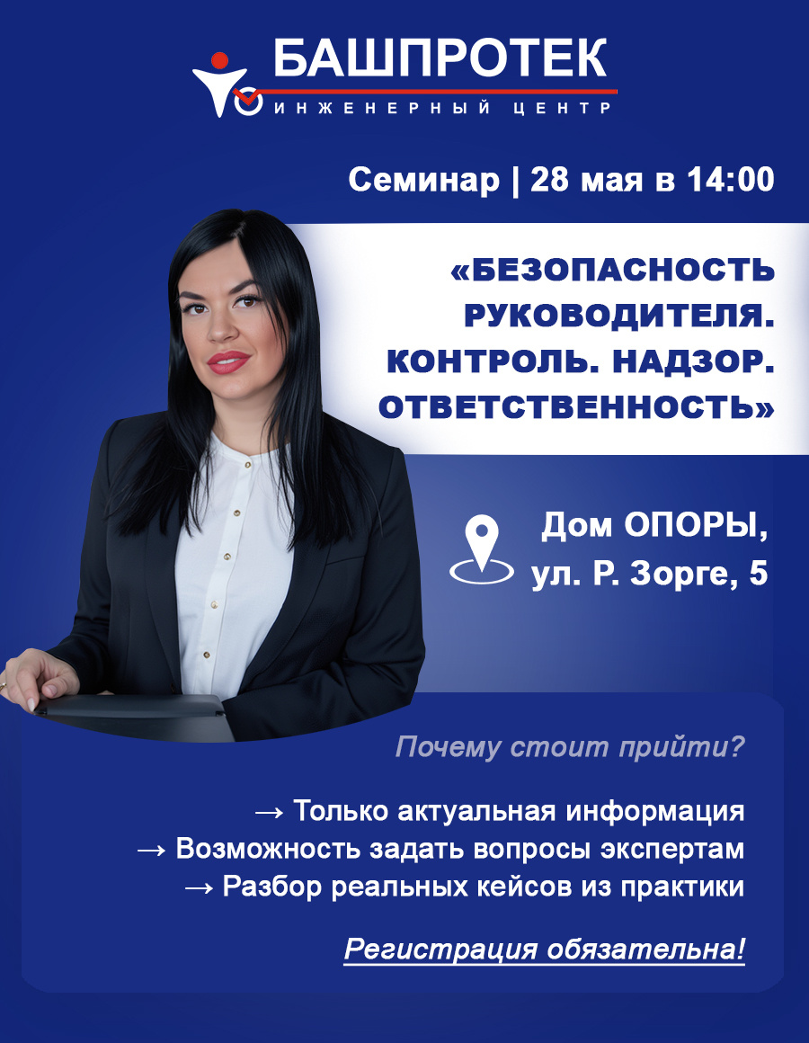 Приглашаем на практический семинар в рамках Недели Предпринимательства: "Безопасность руководителя. Контроль. Надзор. Ответственность". 28 мая в 14:00 | Дом ОПОРЫ (Уфа, ул. Р. Зорге, 5) Разберём ключевые вопросы для руководителей: Спикеры: ✔ Представители контролирующих органов (МЧС, Ростехнадзор, Трудовая инспекция) ✔ Наталья Скокова (модератор) - председатель Комитета по безопасности БРО "Опора России", основатель ГК «Фоксгард» ✔ Елена Батырова - председатель Комитета по пожарной безопасности БРО «Опора России», руководитель ООО ИЦ «Башпротек», эксперт по лицензированию (10+ лет опыта) ✔ Наталья Третьякова – специалист по экологической безопасности ✔ Анастасия Крещенова – юрист-практик (14+ лет), медиатор Почему стоит прийти? → Только актуальная информация – без «воды» → Возможность задать вопросы профильным экспертам → Разбор реальных кейсов из практики 📍 Регистрация обязательна по ссылке: https://konsalt-ru.timepad.ru/event/3373299/