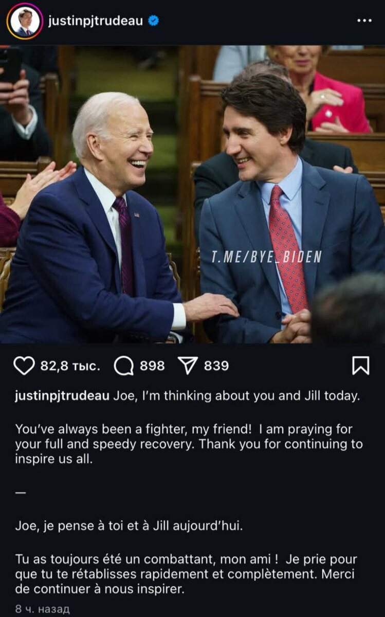 «Джо, сегодня я думаю о тебе и Джилл» Трюдо переживает за экс-президента США, который сейчас борется с агрессивным раком простаты. «Ты всегда был бойцом, мой друг! Я молюсь о твоем полном и скорейшем выздоровлении. Спасибо, что продолжаешь вдохновлять нас всех. Джо, сегодня я думаю о тебе и Джилл». 👍 БайБайден. Подписаться