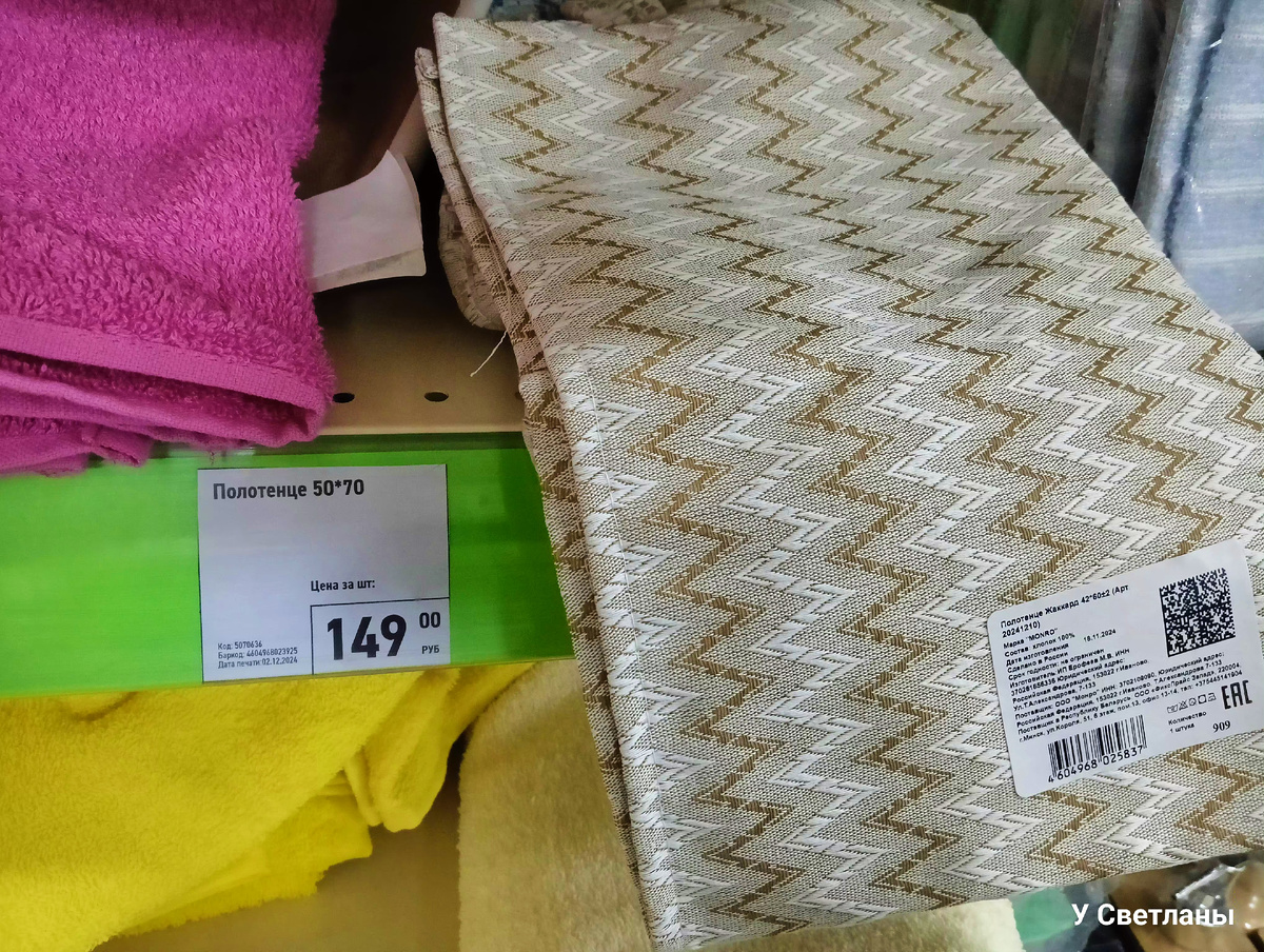 Будучи в Фикс-прайсе, не смогла пройти мимо текстильных полок, уж очень красивые кухонные полотенца разложены. Бежевого цвета плотенчик жаккардовый кухонный по 149 рублей. Размер - 50×70 см. На ощупь - приятный хлопок. Жёлтенький, по такой же цене, такого же размера, по фактуре слегка, как бы вафельный. Полотенце вафельное - 79 р. Размер 35×60 см. Расцветки разные, пёстрые. Рядом с полотенцами висят мочалки для тела, а я думала - прихватки, уж очень на них они похожи. Их цена - 55 р. И ещё одна симпатичная мочалка для тела по такой же цене. Не знаю, почему именно мочалка, если она даже не шершавая, а мягкая, как прихватка. Милой расцветки полотенце по 83 р, оно большого размера, но тонкое по фактуре. В развёрнутом виде. Милый рисунок на нём. До того тонкое, что думаю, на месяц использования хватит. Белого цвета полотенце. Цена - 83 р. Большое. По фактуре так же тонкое, как и предыдущее. Вафельный полотенчик, плотная ткань, написано, что хлопок 100%, приятный на ощупь. Его размер - 45×