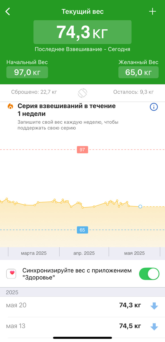 Один сайт по подсчету калорий обещает мне, что если я буду есть в пределах 1800-1900 калорий и заниматься спортом, то к 18.10.2025 я буду 65 килограмм. Я пока не знаю останавливался на этой цифре или худеть до 60 килограмм. Андрей сказал, что боится, что от меня одни глаза останутся. Но я честно раньше нового года на эту цифру не рассчитываю.