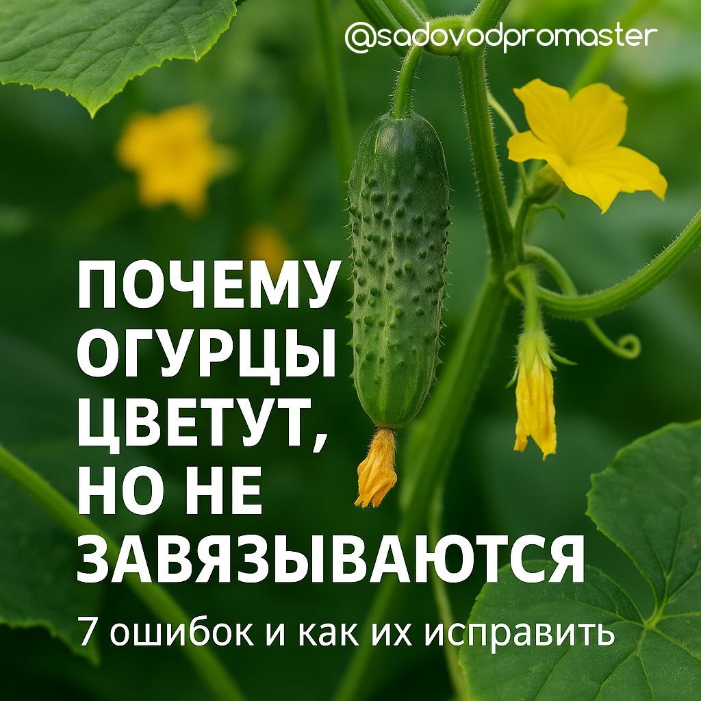 🥒 Почему огурцы цветут, но не завязываются: 7 ошибок и как их исправить Огурцы цветут, но завязей нет? Или они появляются, но желтеют и опадают? Не спешите винить погоду — чаще всего причина в уходе. Разберёмся, что пошло не так и как вернуть урожай! 1️⃣ Слишком много азота — листья пышные, а плодов нет • Признак: пышная ботва, пустоцвет. • Причина: переизбыток навоза, мочевины, азотных удобрений. • Решение: подкормите золой (1 стакан на 10 л воды) или комплексом с фосфором и калием. 2️⃣ Плохое опыление — пчёлы в отпуске • Признак: женские цветки не дают завязей. • Причина: пасмурная погода, закрытая теплица. • Решение: привлеките пчёл мёдом (1 ст.л. на 1 л воды) или опыляйте вручную. 3️⃣ Мало света — завязи в тени не растут • Признак: цветки есть, но внизу ничего не развивается. • Причина: загущенные посадки, тень от кустов. • Решение: подвяжите плети, прищипните боковые побеги, проредите ряды. 4️⃣ Перепады температуры — стресс и сброс завязей • Признак: цветение есть, завязи ме